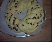Con un coltello affilato, tagliatelo in due per la lunghezza ricavando due strisce che intreccerete in una treccia semplice tenendo i lati aperti nella parte superiore. Formate una ciambella che adagerete su carta forno in una teglia.