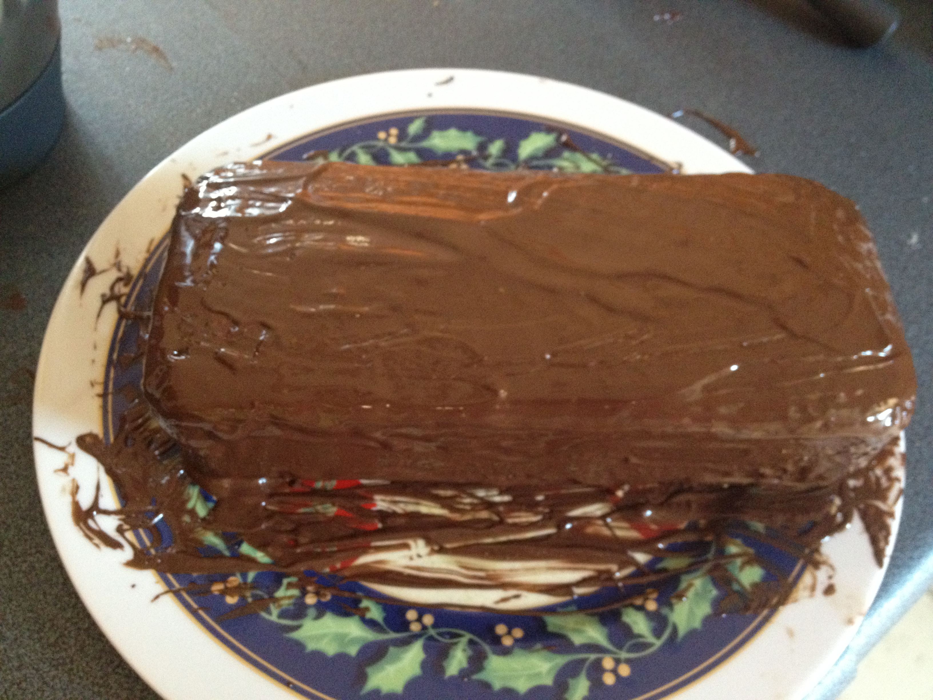 11. Ricoprire il dolce con il cioccolato fuso, distribuendolo anche sui lati.