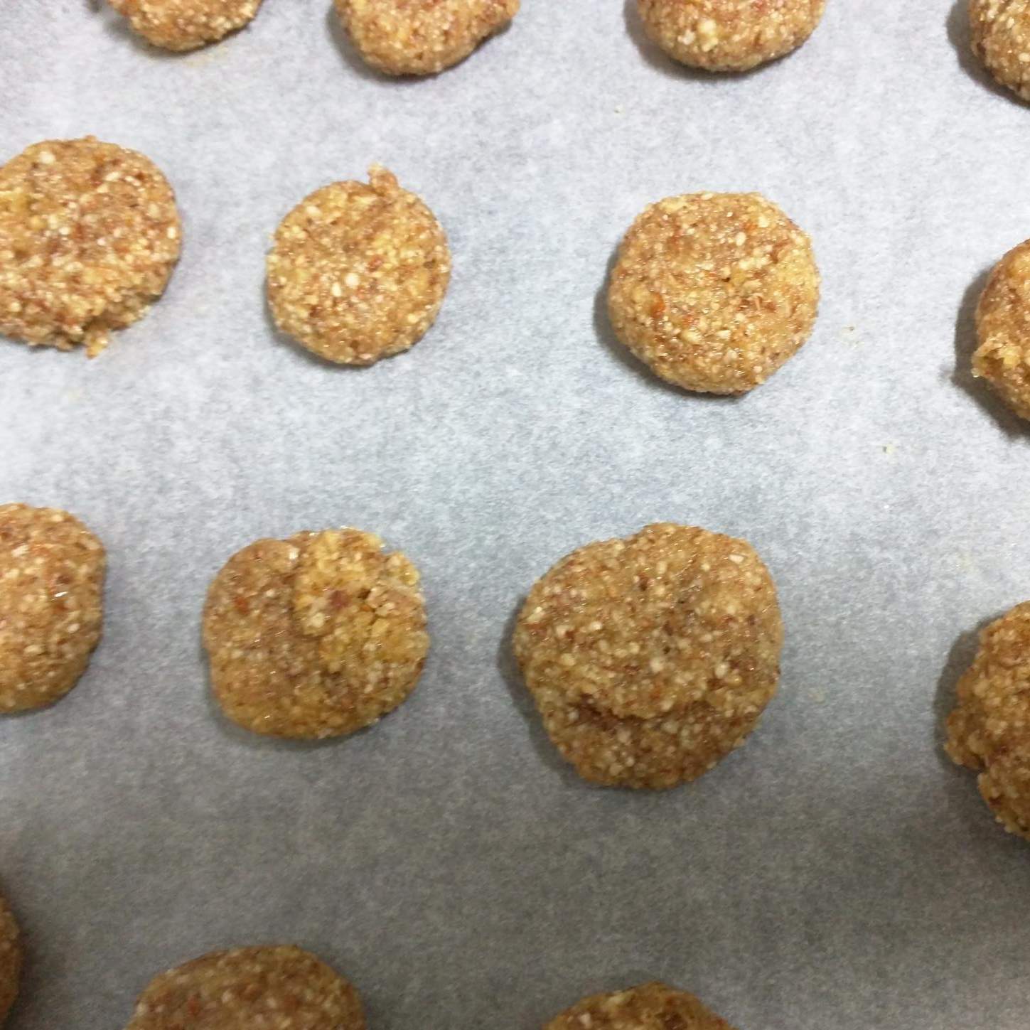 Formare delle palline e disporle un po'distanziate su una teglia con carta forno e appiattirle leggermente.