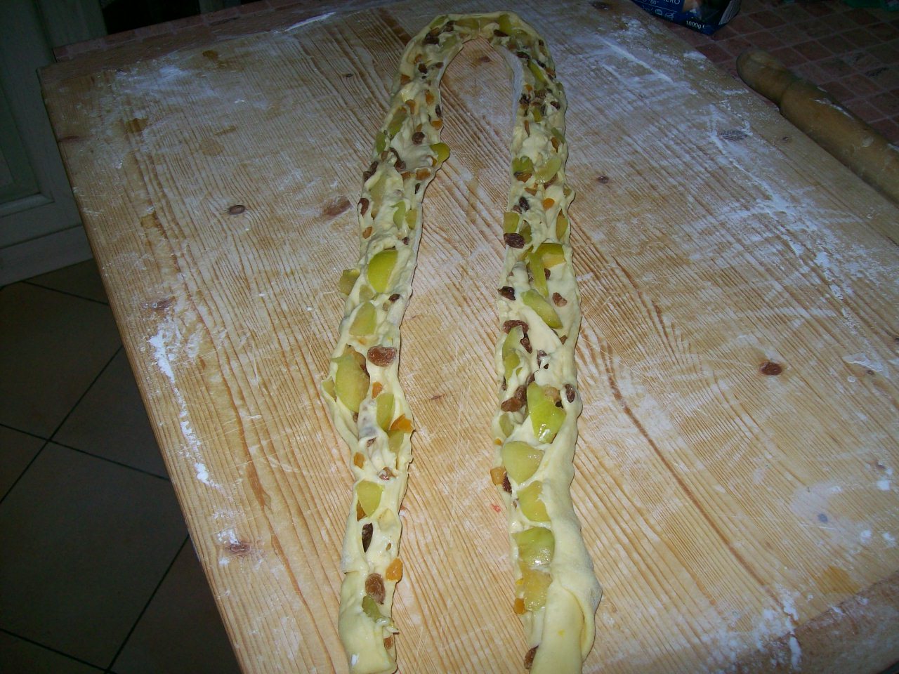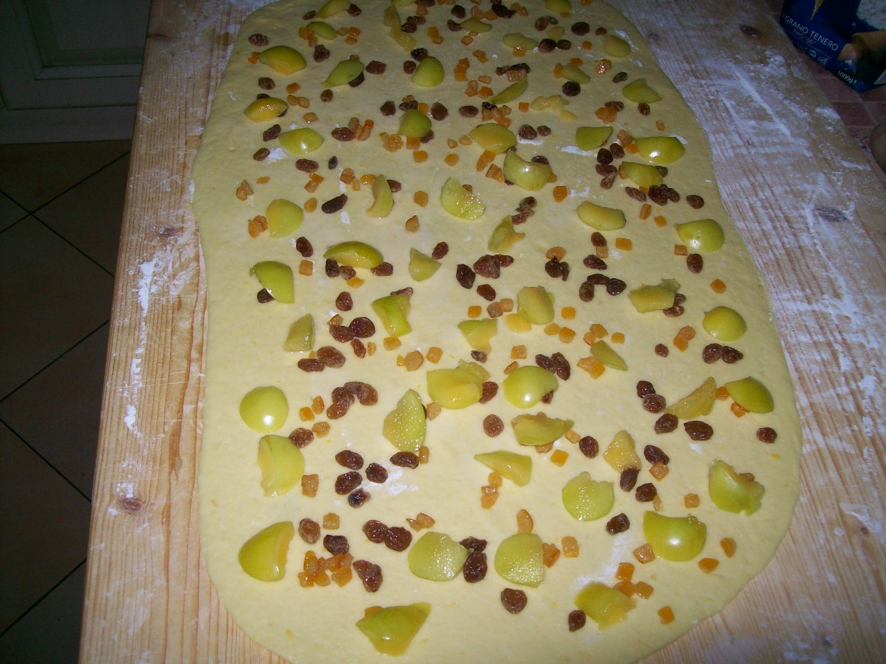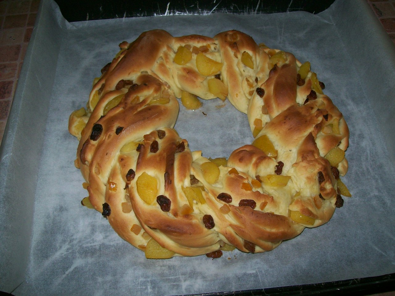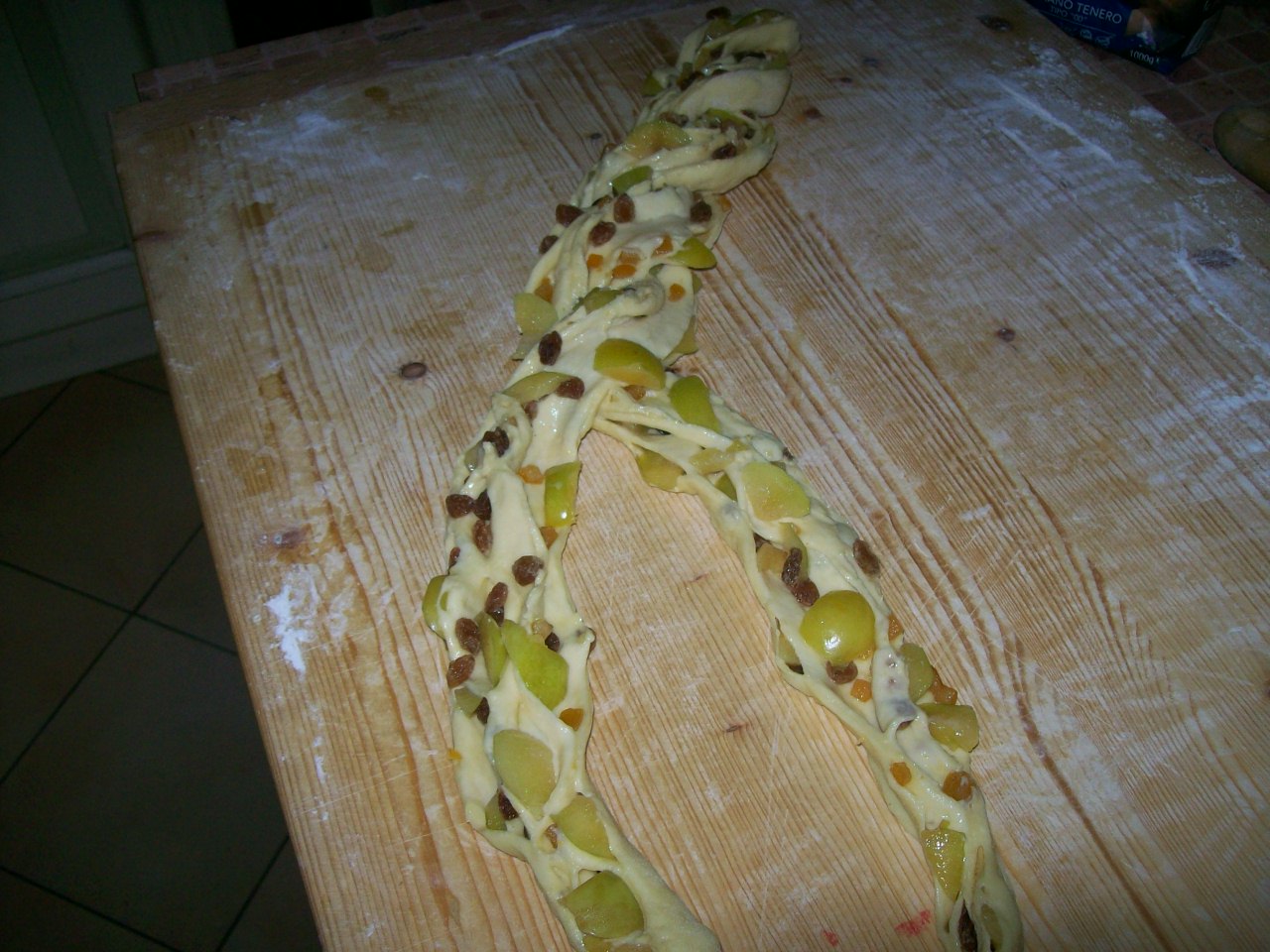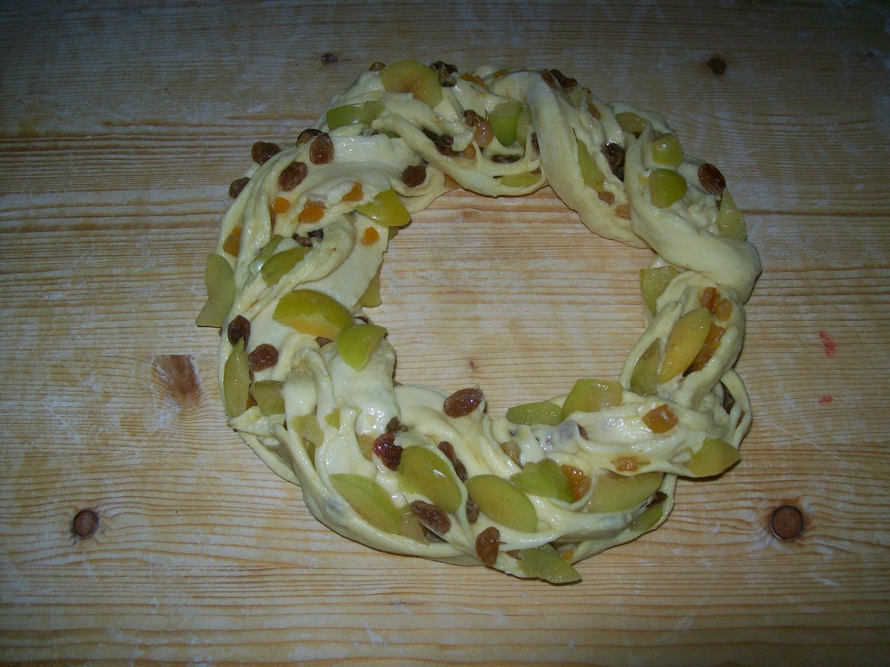"velocità spiga" . Stendere la pasta in un rettangolo sottile ( io ho fatto 2 più piccoli), farcire con le scorzette, l'uvetta- ammollata nel liquore e strizzata, le prugne a pezzetti. Arrotolare, formare la corona, come da foto. Lasciare a lievitare fino a raddoppio. Cuocere nel forno già caldo. 175-180° / 25min circa. Sciogliere il cioccolato a bagnomaria, decorare il dolce.