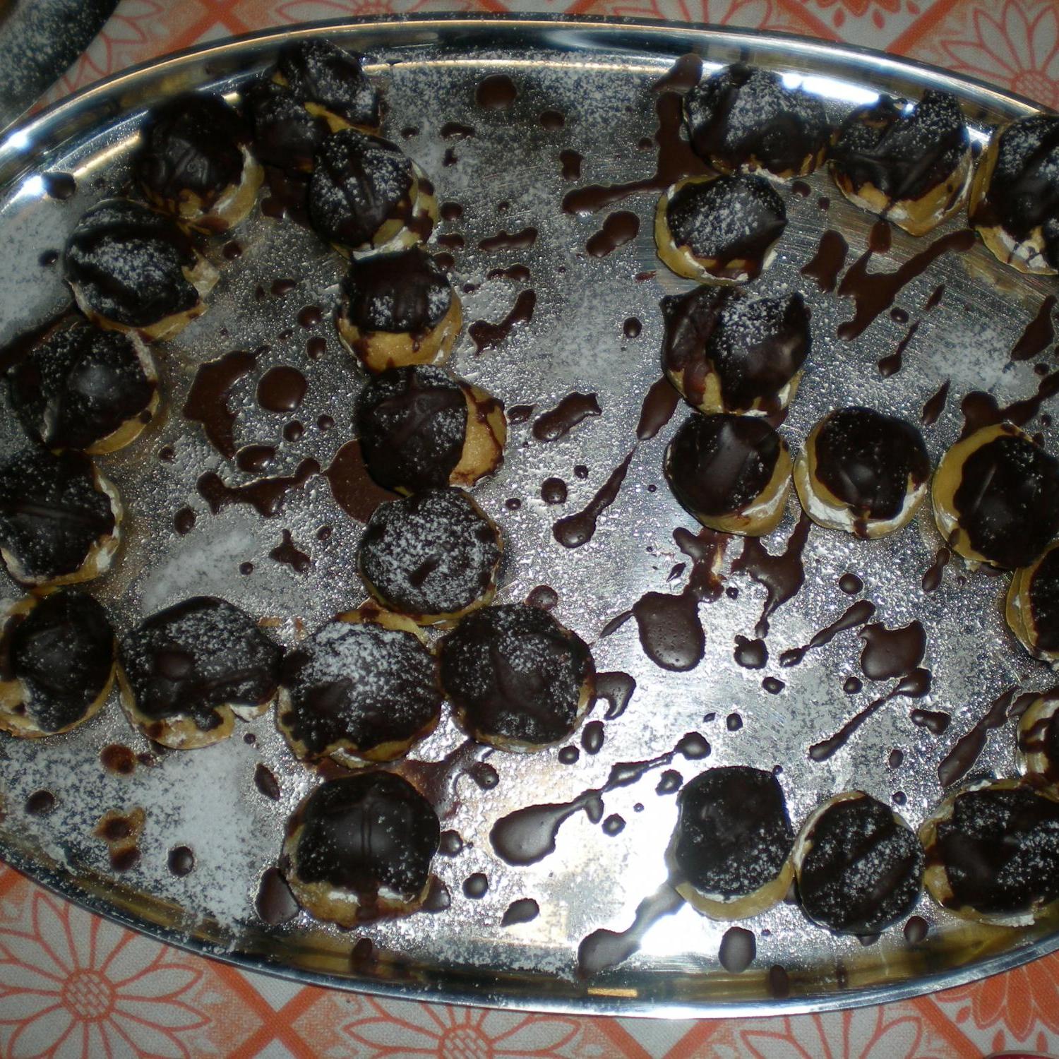 PREPARARE UNA DOSA DI PASTA CHOUX COME DA LIBRO BASE,FORMARE TANTI BIGNE' E CUOCERE IN FORNO.MONTARE LA PANNA COME DA LIBRO BASE AGGIUNGENDO LA FIALETTA DI AROMA ALL'ARANCIA O QUELLO CHE PREFERITE.UNA VOLTA COTTI I BIGNE' E FATTI FREDDI ,TAGLIARLI A META' E RIEMPIRE CON LA PANNA AROMATIZZATA.SCIOGLIERE IL CIOCCOLATO A PEZZI CON 3-4 CUCCHIAI DI PANNA O LATTE,(IO PER COMODITA' L'HO SCIOLTO AL MICROONDE).INZUPPARE LA PARTE SUPERIORE DEI BIGNE' NEL CIOCCOLATO.DISPORRE SUL VASSOIO CREANDO LA FORMA DESIDERATA E DECORARE CON IL CIOCCOLATO RIMASTO E ZUCCHERO A VELO.