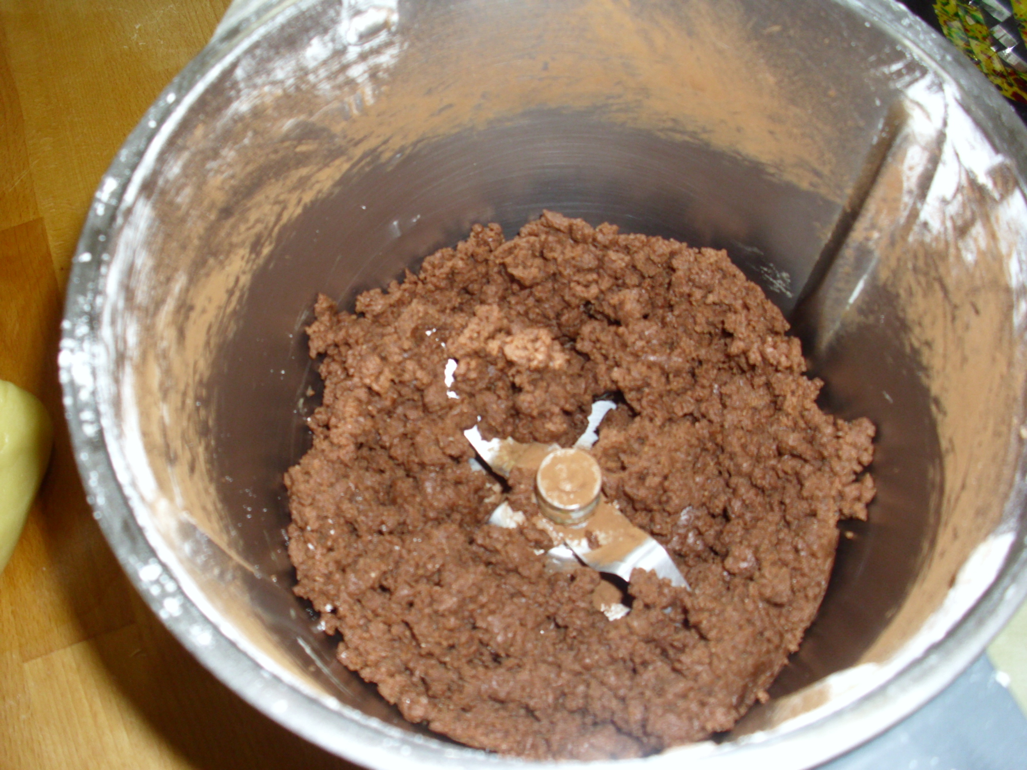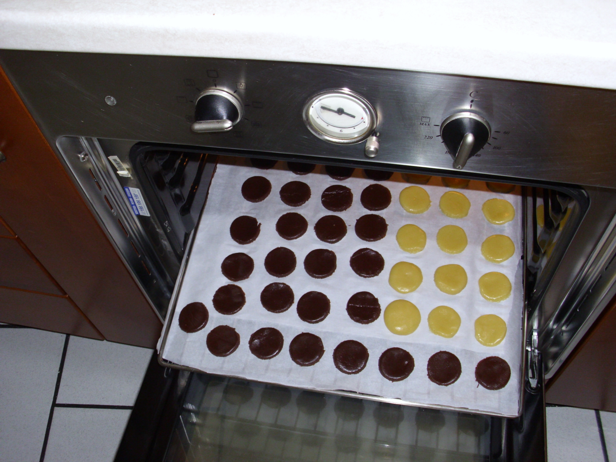 "coperchio chiuso" aggiungendo 2 cucchiai di cacao amaro,lavoratelo x 20" vel.4/6, dopodiche versare il composto sul tavolo da lavoro e formate un panetto. A questo punto tirare uno dei panetti tra due fogli di carta da forno,e con uno stampino fate tanti dischetti "ATTENZIONE QUANDO TIRATE LA PASTA NON FATELA SOTTILE ALTRIMENTI QUANDO ALZERETE I DISCHETTI X POGGIARLI SULLA TEGLIA SI ROMPONO" lo stesso procedimento lo fate con laltro panetto.SIA I DISCHETTI NERI CHE QUELLI BIANCHI DEVONO ESSERE DELLO STESSO NUMERO X POTERLI POI ACCOPPIARE INFORNARE a180°x 20 min. (far fede sempre al proprio forno), finita la cottura, lasciare raffreddare i biscotti.X LA FARCIA: lavorare nel