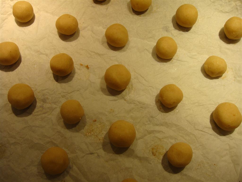 Formare le palline (circa 24) e disporle sulla carta forno in una placca.