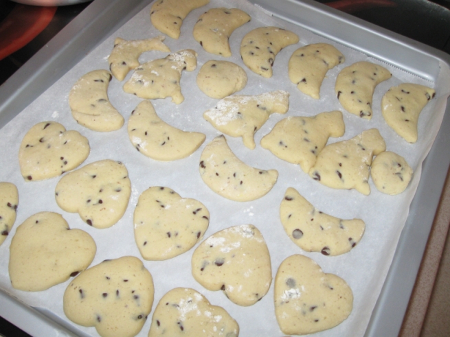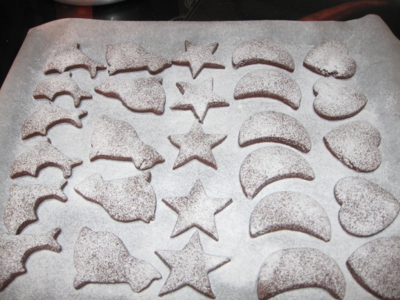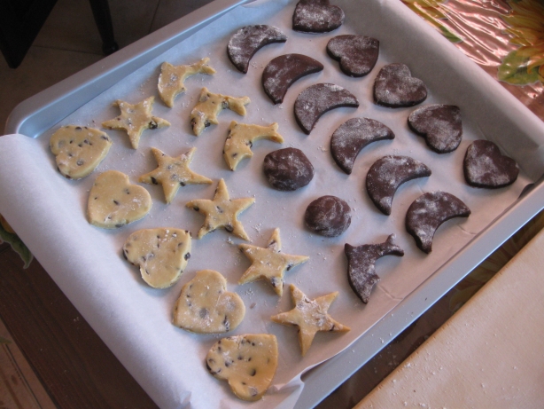 Trascorso il tempo in frigo, disporre prima un impasto e poi l'altro sulla spianatoia e stenderlo con il mattarello ad uno spessore di circa 1 cm., con le formine per i biscotti tagliare le varie sagome e disporle su una teglia ricoperta di carta forno (a me ne vengono circa 3 per un totale circa di 80 biscotti).