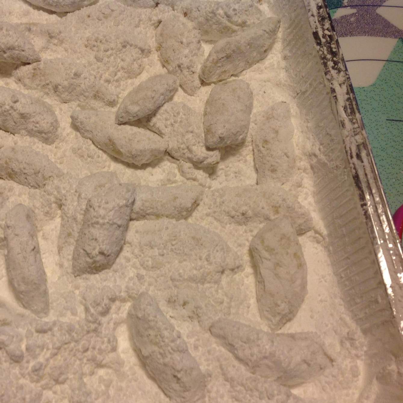 In una teglia grande mettere abbondante zucchero al velo (MOLTO FINE) e mettere i biscotti ancora caldi rotolandoli più volte delicatamente, spostandoli in un'altra teglia con abbondante zucchero e abbondante sopra i biscotti caldi (che vanno rigirati subito in un'altra teglia con lo stesso procedimento).