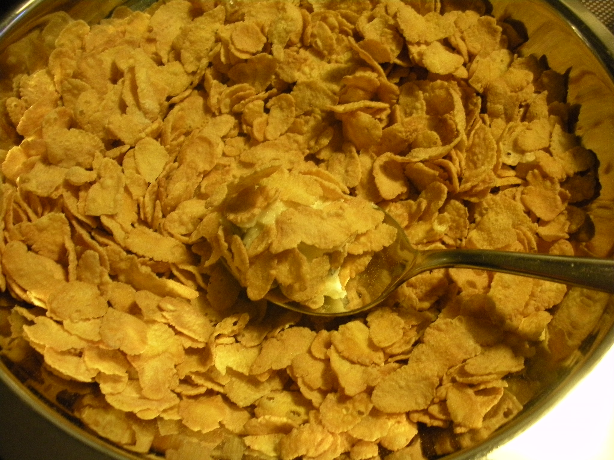 1. Zucchero e uova nelcoperchio chiuso"coperchio chiuso" 10 sec vel 4,aggiumgere burro10 sec vel6,poi mettere la farina 10 sec vel 5 mettete il composto in una ciotola e unite le gocciole,per formare i biscotti aiutatevi co 2 cucchiai l'impasto è molto morbido prendere un pò di composto e passatelo nei corn flakes,poi metteteli sulla carta forno e abbassateli un poco con il cucchiaio metteteli in forno 160 20 minuti,diminuite minuti in base alla grandezza dei biscotti cottura ultimata una spolverizzata zucchero a velo.VARIANTE (gocce di cioccolato o uvetta o riso soffiato al cioccolato)