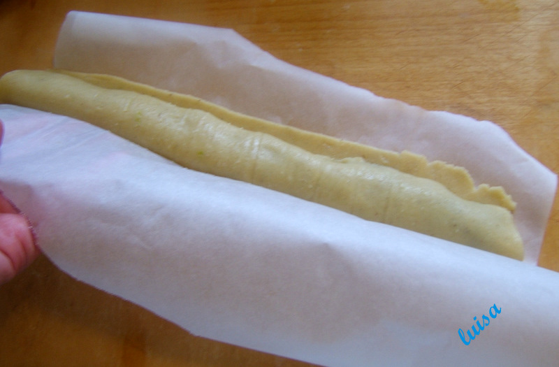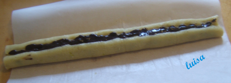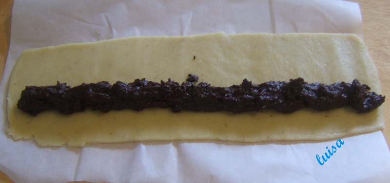 Riprendere la frolla e dividerla in due parti (quella che non serve subito, metterla ancora in frigo), formare un salame e poi stenderla in un rettangolo fra due fogli di carta forno. depositare un cordone di  ripieno, disponendolo non proprio al centro del rettangolo, ma verso i 2/3. Aiutandosi con la carta forno ripiegare la pasta sull'imbottitura e chiudere a portafoglio sigillando la pasta.