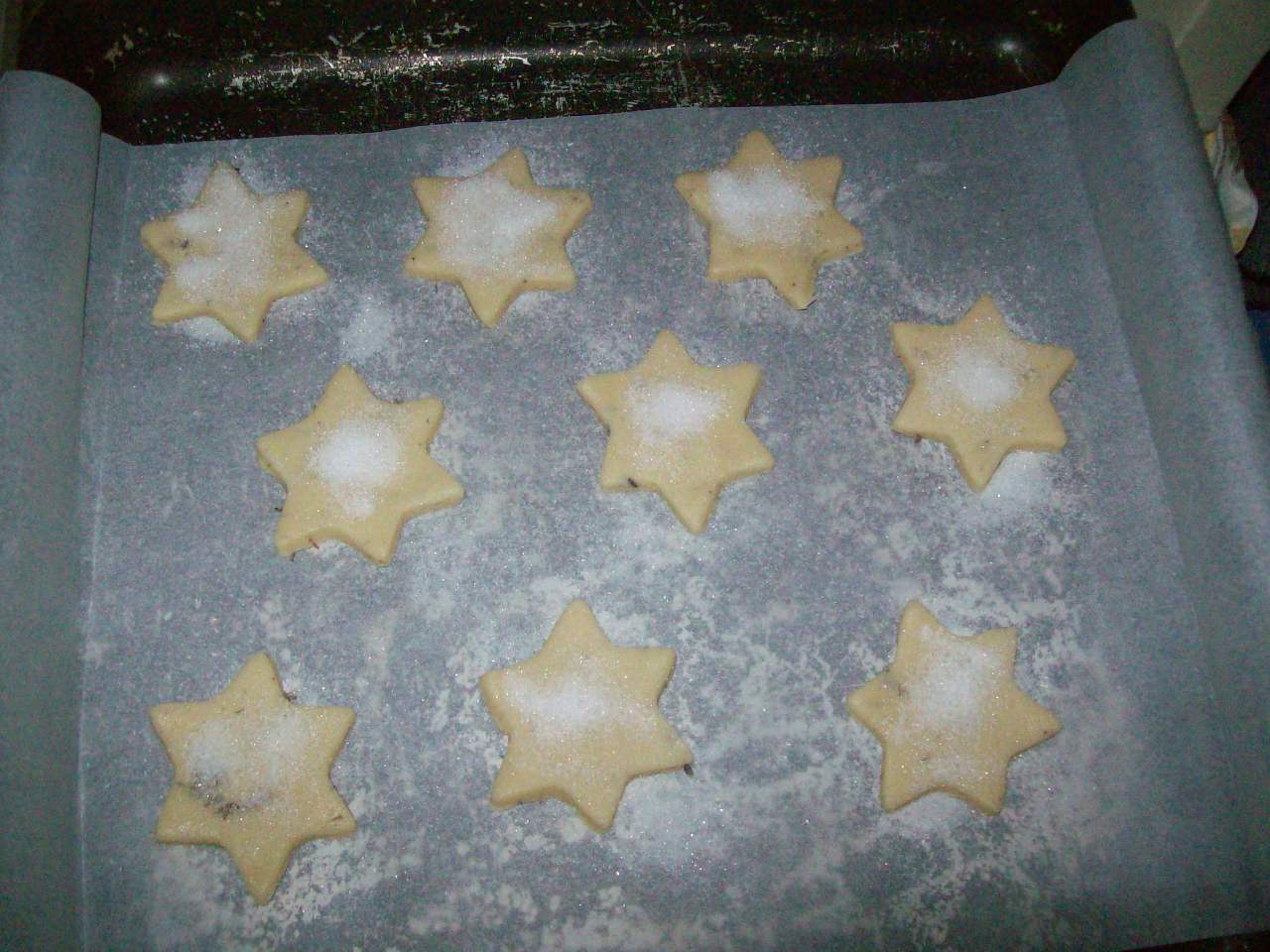 "coperchio chiuso" inserire tutti gli ingredienti, tranne lo zucchero x la decorazione : 20sec / vel 5. Stendere l'impasto ( 5mm), ritagliare dei biscotti a piecere, spolverli generosamente con lo zucchero. Cuocerli nel forno già caldo: 170° / 10-15min. Raffreddarli fuori. Io li ho decorati anche con le gocce di ciocco.
