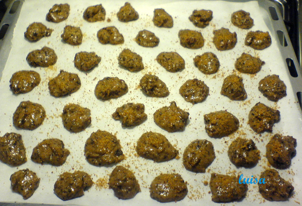 Coprire con un foglio di carta forno la teglia e mettere l'impasto a cucchiaini distanziati fra loro, spolverare i mucchietti con lo zucchero rimasto