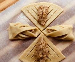 - Dividere in 4 spicchi, incidere a V la pasta e sistemare al centro un cucchiaino di farcia, portare l'estremità del triangolo verso il centro.