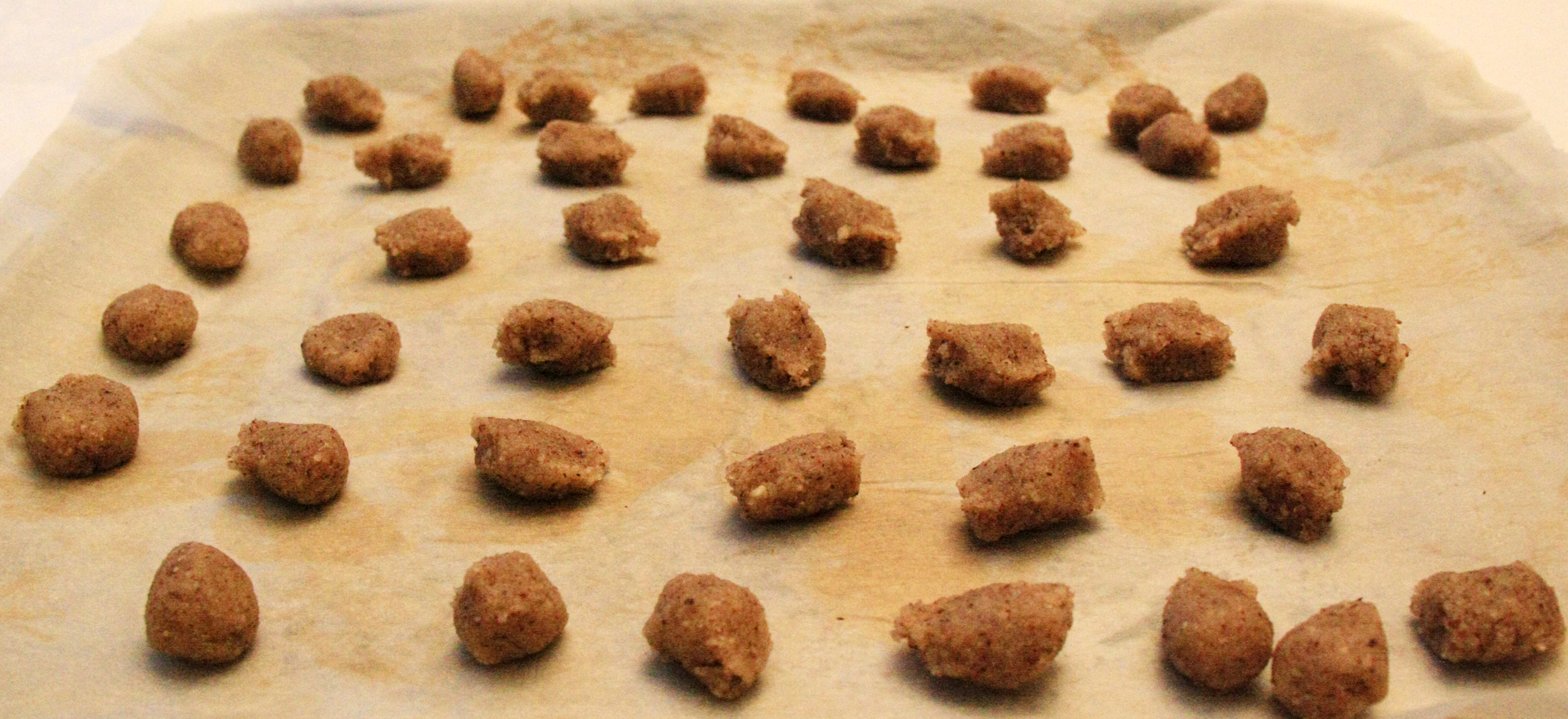 Quando è ben freddo preparare un salamino della grandezza di un dito e e tagliare con le dita , formare delle palline leggermente schiacciate con le dita . mettere su carta forno.