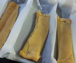 - Arrotolare ogni striscia e metterle in una teglia con carta da forno e disporvi le strisce separandole con la carta affinché non si attacchino tra di loro in cottura. A piacere, bagnare con del latte e cospargere con granelle di zucchero / codette o zucchero di canna.