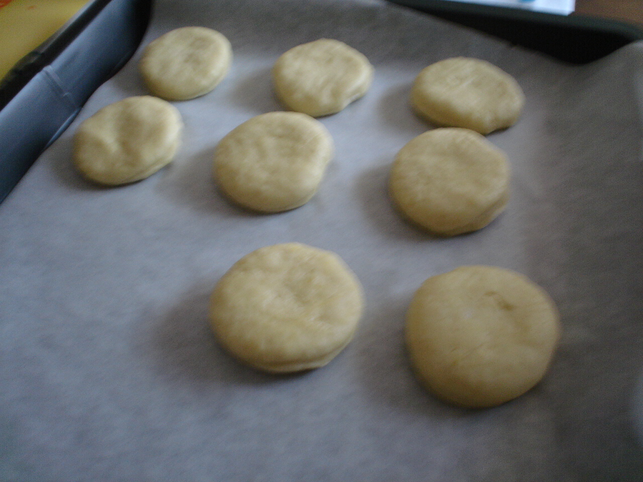 Trascorso questo tempo di lievitazione, magari infarinando leggermente la spianatoia e la superficie dell'impasto, appiattire con un mattarello fino allo spessore di 1 cm circa e ricavare con un tagliapasta diametro 5cm dei dischetti. Foderare di carta da forno due teglie e sistemarvi sopra i dischetti ottenuti. Questi devono riposare al riparo da correnti d'aria (io li ho posizionati nel forno spento preriscaldato a 50° per 5 minuti) fino a raddoppio (circa 45 minuti).