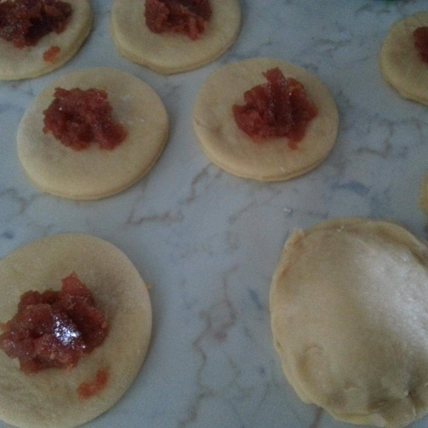 Stendere la pasta mezzo cm e tagliare dei dischi di circa 6-7 cm di diametro. Riempirne la metà con un cucchiaino di marmellata e coprire con un altro disco chiudendo i bordi.