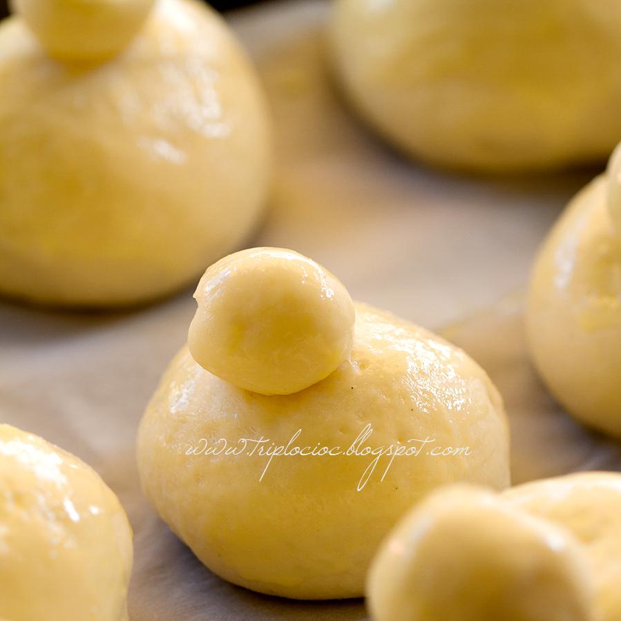 Fare lievitare, nel forno preriscaldato a 50° e poi spento, per 1 ora, coperto con pellicola.Dividere l’impasto formando delle palline di circa 60 gr, lasciare un pò di ipasto per le palline più piccole (il "tuppo"), sovrapporre le palline piccole in quelle grandi e lasciare lievitare per altri 30 min. sempre al caldo. Prerscaldare il forno ventilato a 200°, spennellarle con il tuorlo ed il latte e cuocerle per 15min stando attenti che non si scuriscano troppo, in caso abbassare a 180°.