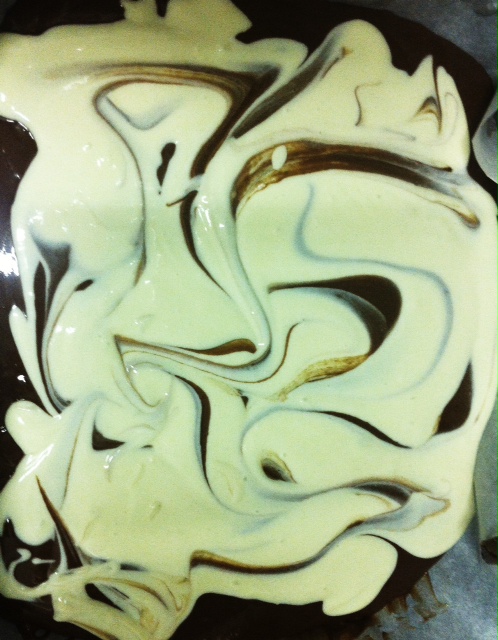 Sopra il composto versare la crema cheesecake a chiazze e con la spatola comporre dei disegni (non mescolare troppo altrimenti i composti si mescolano).