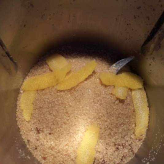 Tritare la buccia di limone con lo zucchero: 20 SEC VEL 8. Riunire sul fondo con la spatola