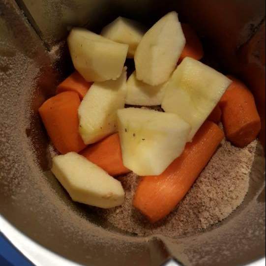 Aggiungere carote e mele a pezzi: 20 SEC VEL 7. Riunire sul fondo con la spatola.