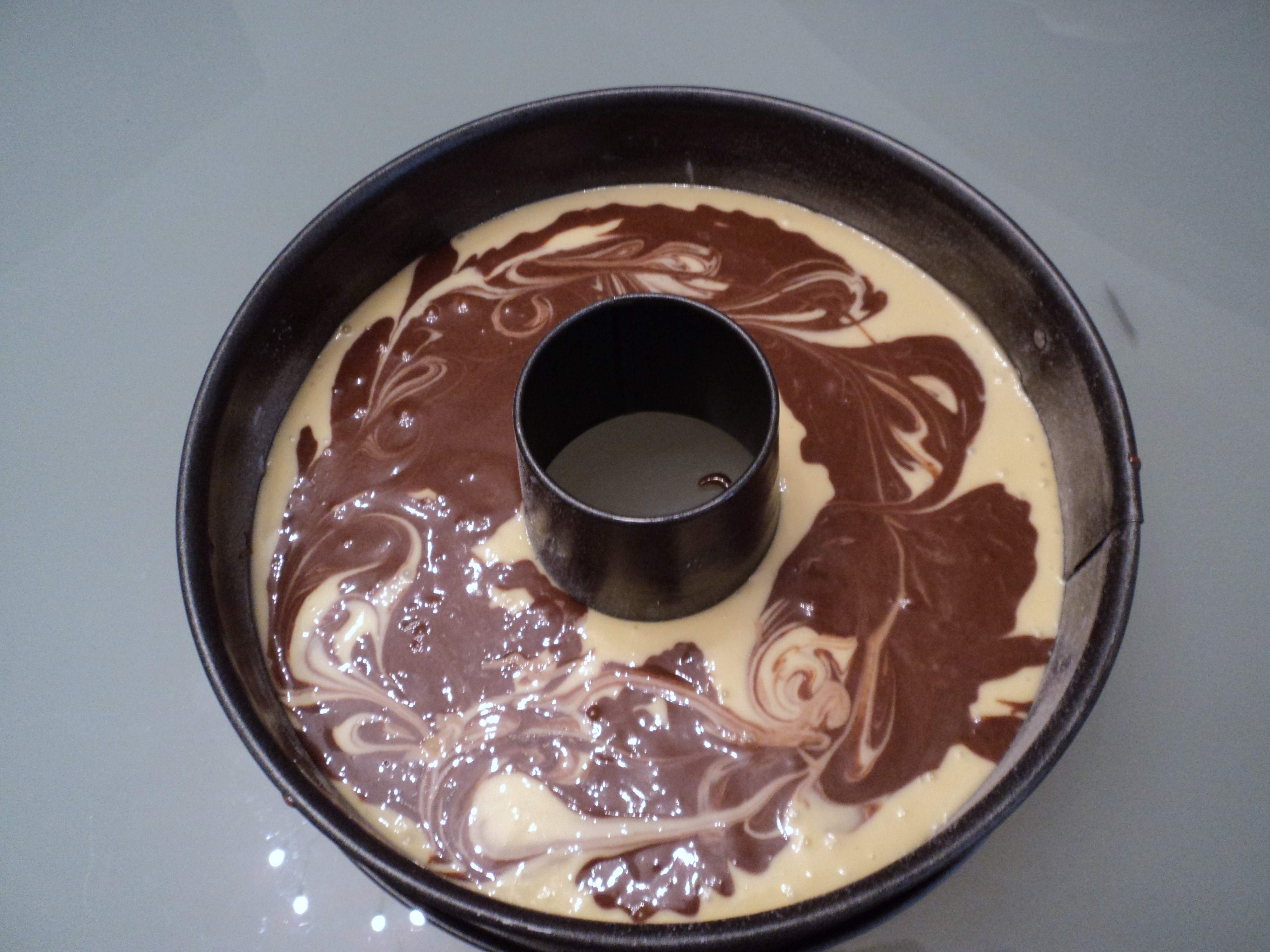 - Versate il composto nella tortiera sopra il composto bianco e con l'aiuto di un coltello a lama liscia, fate dei movimenti dall'alto verso il basso, formando delle spirali, sui due colori dell'impasto fino ad ottenere l'effetto marmorizzato.