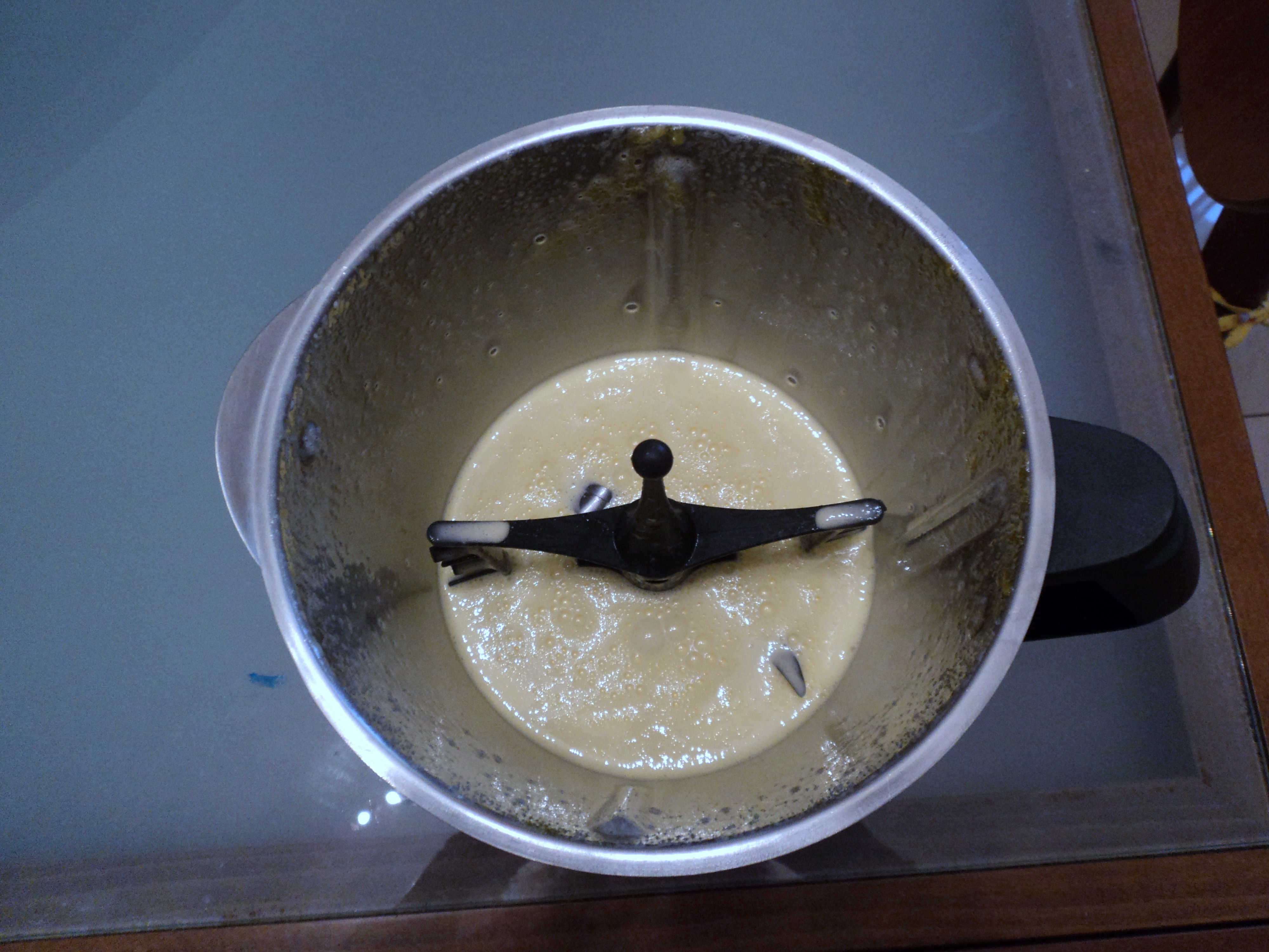 "coperchio chiuso" le 3 uova intere e lo zucchero: montare 4 min. vel 4. - Togliere la farfalla, unire l'olio di semi, l'acqua, la farina e la vanillina, amalgamare: 1 min. vel 5.