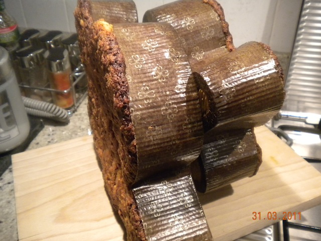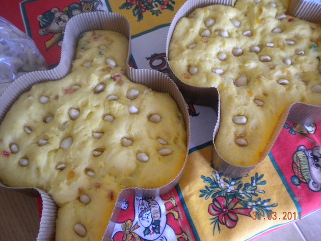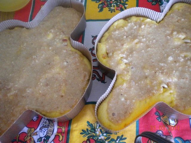 Dopo aver lavorato bene sistemate l’impasto in 3 stampi da colomba da 500 o 2 da 750 gr. affondate le mandorle e coprite le colombe con la farcia.