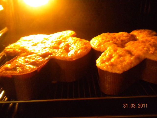Quando la lievitazione sarà completata, togliete delicatamente le colombe dal forno, accendete il forno a 170° statico e quando sarà a temperatura infornate le colombe che cuoceranno in circa 40/50 minuti. Verificate la cottura con lo stecchino.(Se vedete che le colombe si scuriscono troppo a metà cottura coprite con carta forno bagnata e strizzata e ultimate la cottura a 150°)