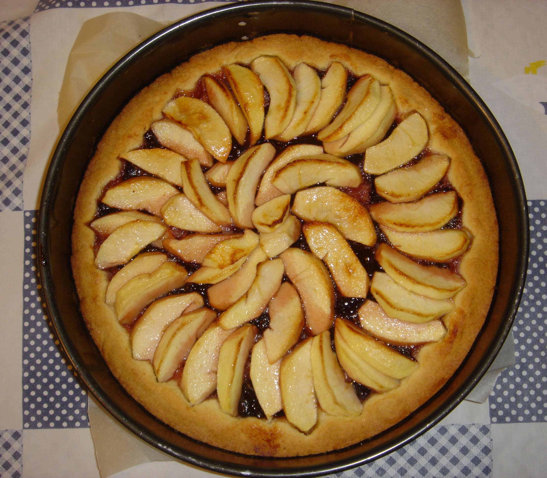 In una tortiera a cerniera foderare il fondo con cartaforno e poi stendere la frolla. Spalmare la marmellata e distribuire le mele. Spolverare con un po' di zucchero e infornare in forno caldo a 180° per 40 min.