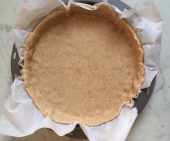 Togliere la pasta frolla dal frigo e, con un matterello, stenderla su un foglio di carta da forno.Lasciando la carta da forno, inserire la pasta frolla in uno stampo per crostata, alzando bene i bordi ed eliminando la pasta in eccesso.Bucherellare il fondo con una forchetta.