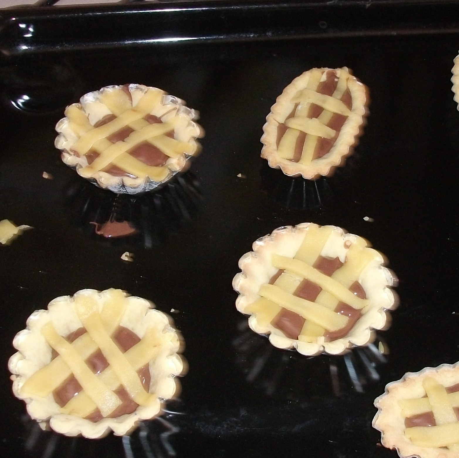 dopo i 10 minuti, tirarle fuori riempirle con la nutella ben sciolta o la marmellata , fare delle strisciette di frolla e disporle a scacchiera sulla crema. Infornare x altri 5 min.