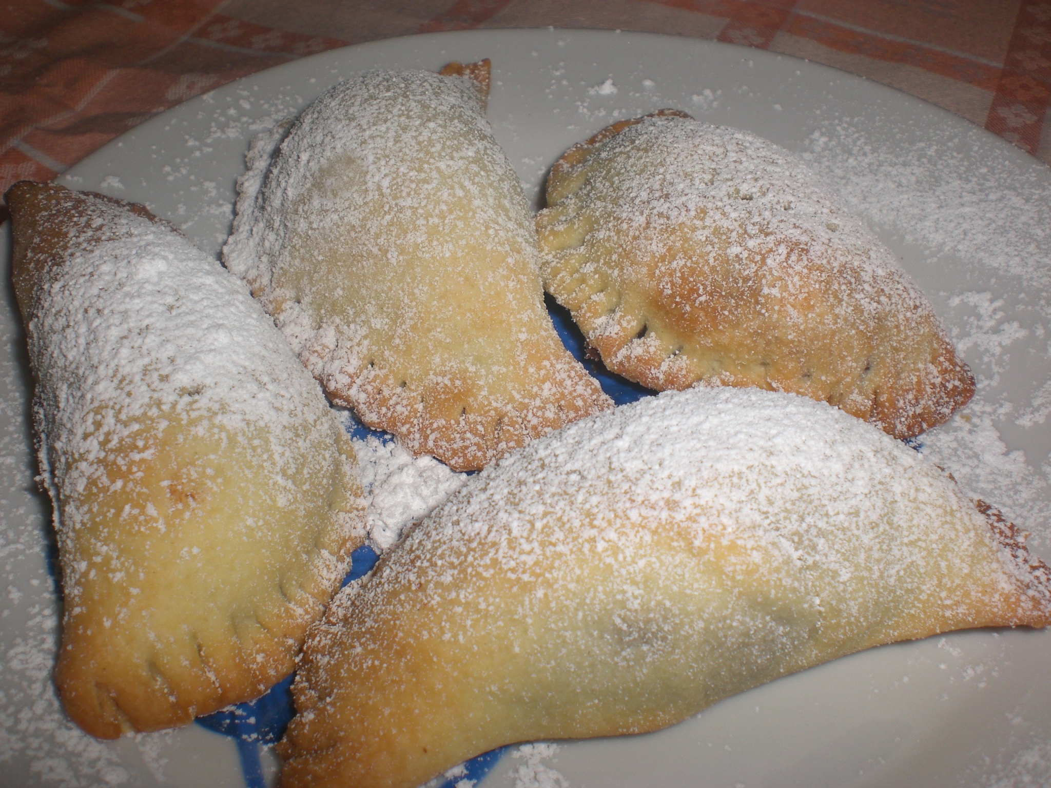 Stendere la pasta non molto sottile, utilizzando la macchinetta per la pasta, ritagliate dei dischi con un bicchiere o taglia pasta abbastanza grande di diametro, inserire un cucchiaio di ripieno, chiudere a mezzaluna e sigillare i bordi con i rebbi della forchetta.Friggere in abbondante olio caldo o cuocere in forno a 180° per 15 min. in base alla cottura del proprio forno. Guarnire con del miele fuso e con abbondante zucchero a velo.