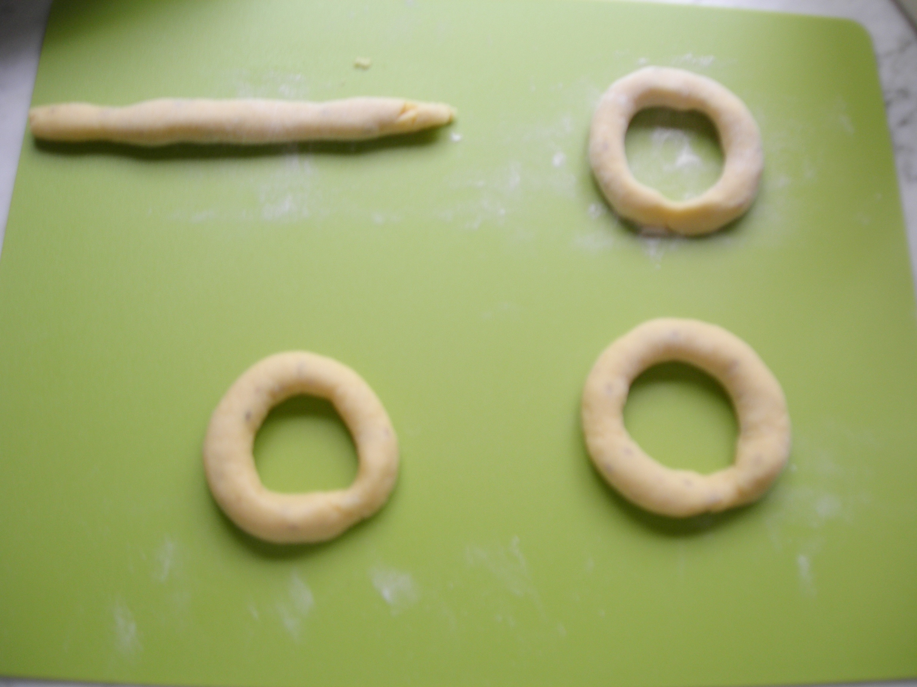 Formare delle strisce cilindriche che abbiano un diametro almeno di 1 cm, unirle a cerchio, disporle su placca infarinata e cuocere in forno caldo per 10-15 min/220°, prestando attenzione di non farli asciugare troppo altrimenti saranno duri.