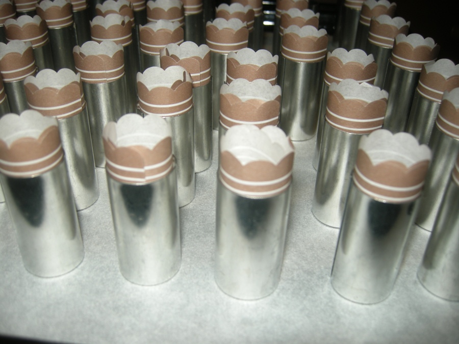 - Con una sac à poche versare nelle cartucce il composto (riempire sia a circa 1 cm dal bordo della cartina) e cuocere per 20 min a 180°.