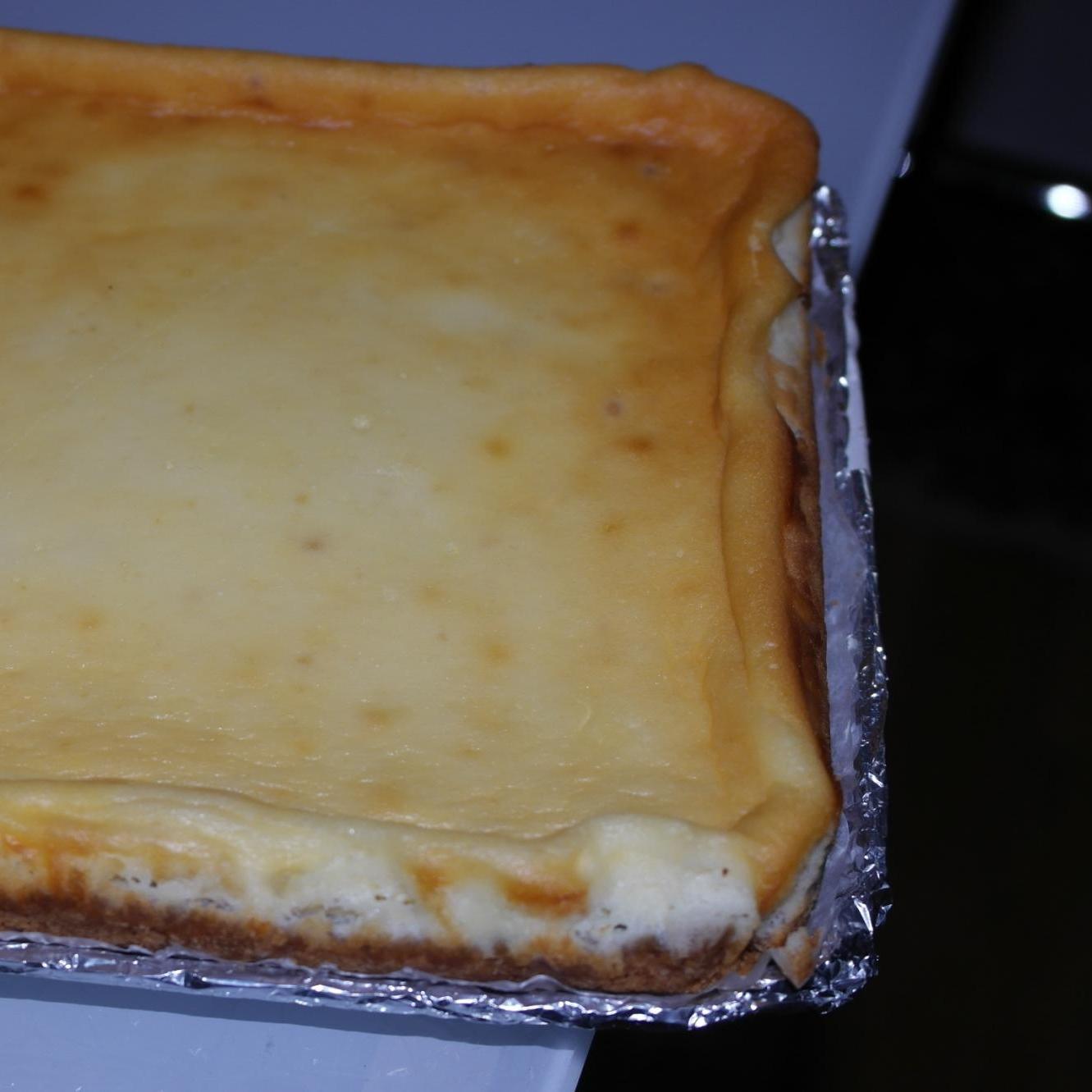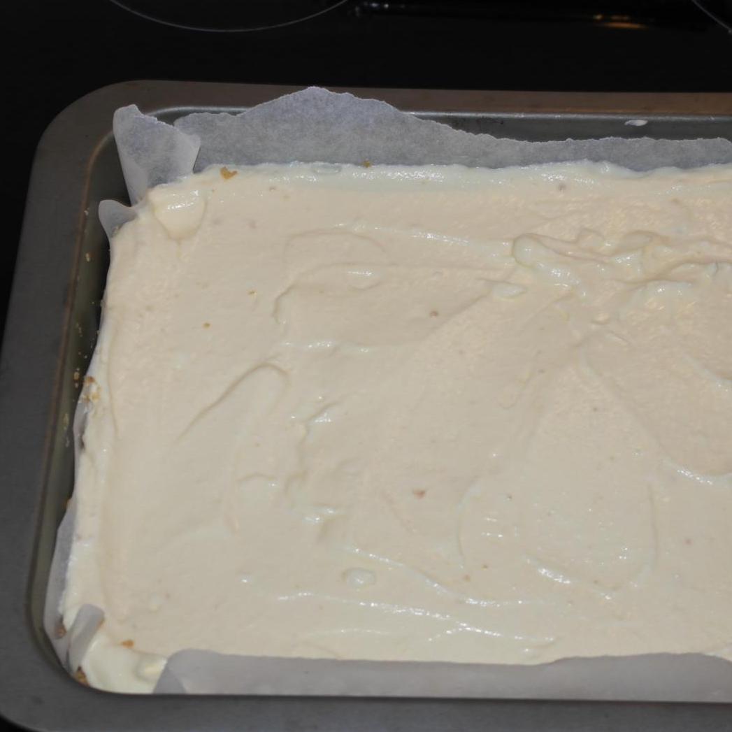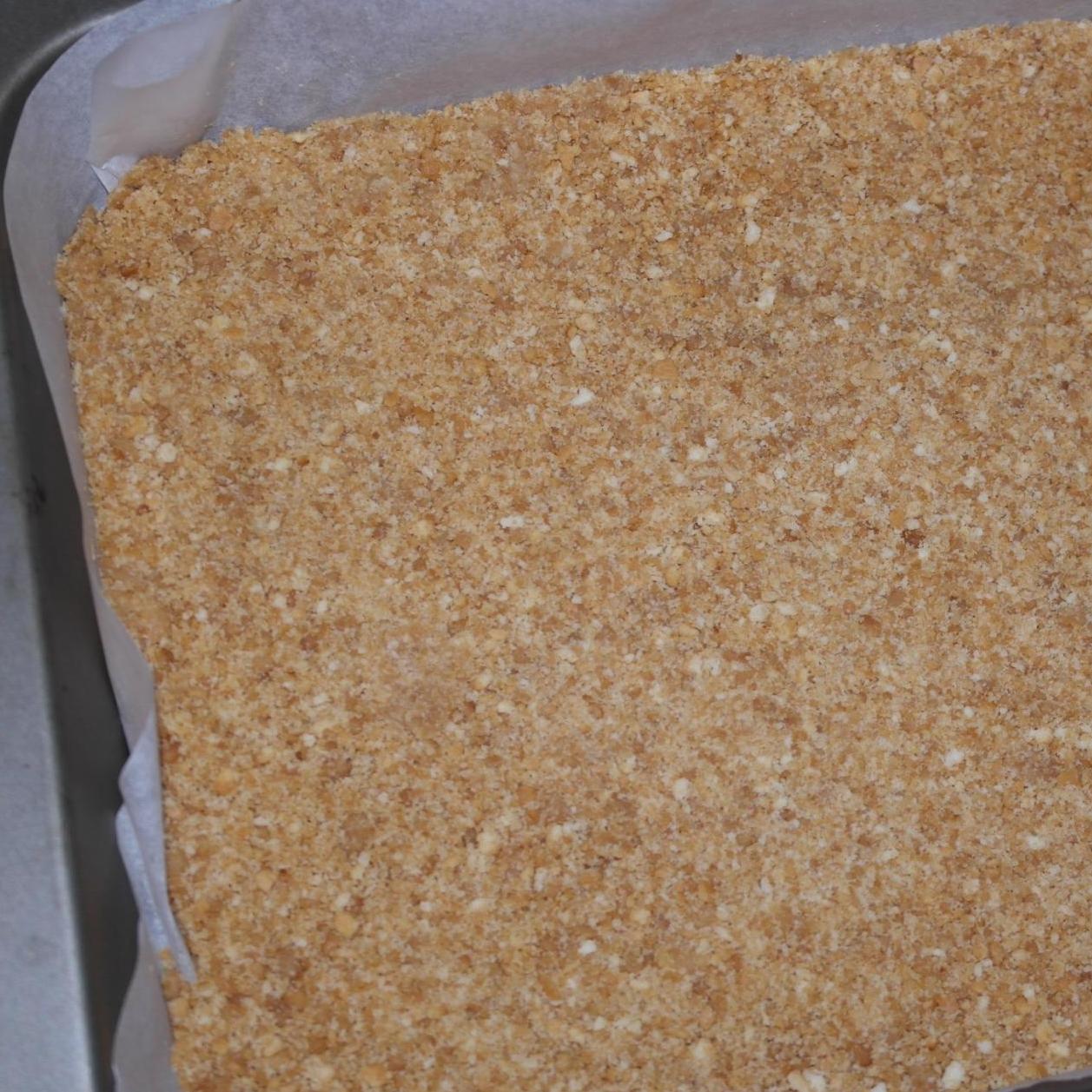 Mettere il composto in una teglia rettangolare foderata di carta forno e livellare bene la base schiacciando con un bicchiere.