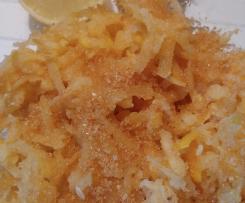 Grattugiare con una grattugia a dentri larghi. - Mettere in una ciotola con il saucco di limone e lo zucchero di canna.