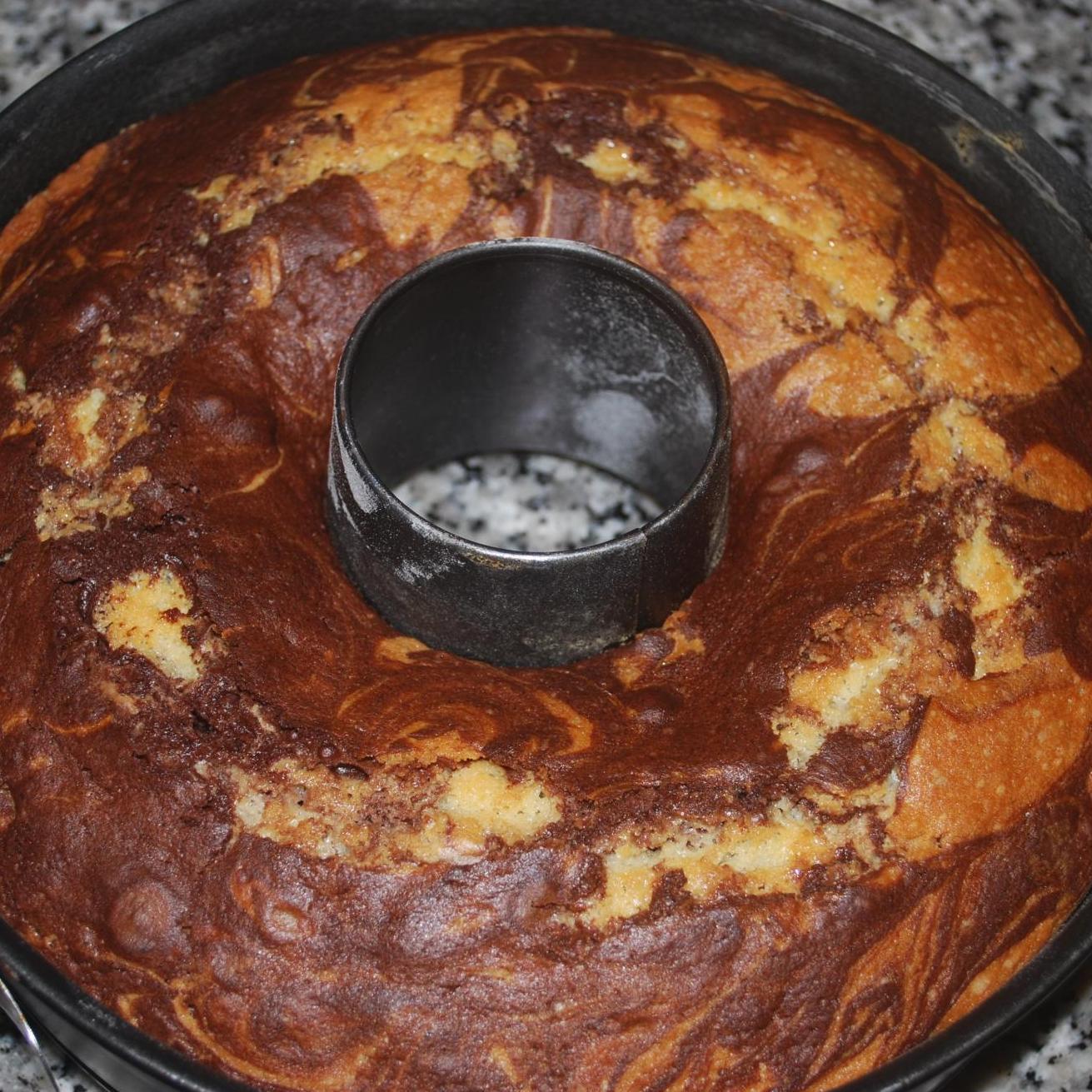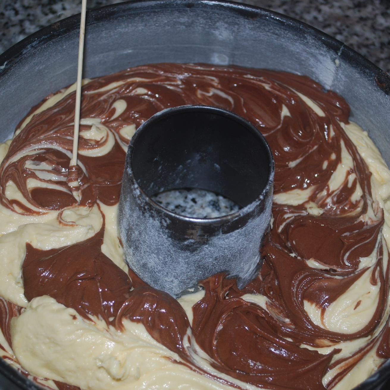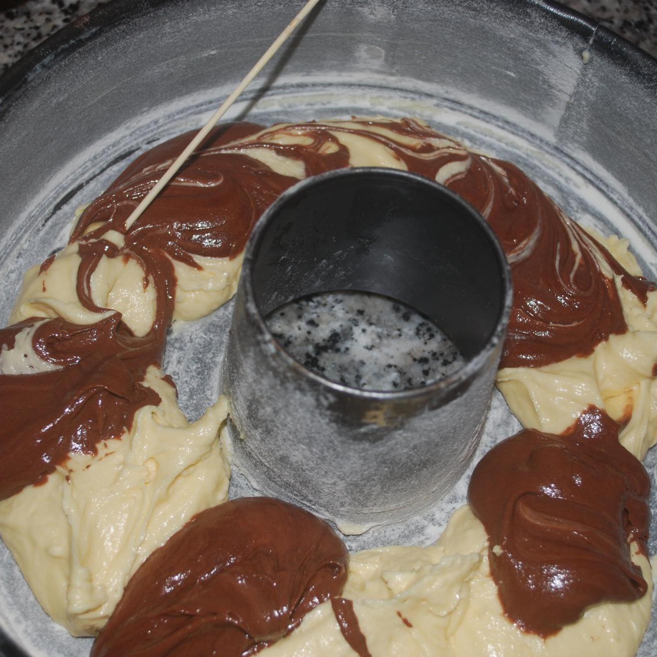 finchè finiamo tutto il giro, poi con il spiedino di legno "mischiamo" tutto(foto 4), in questo modo otterremo un risultato a zic-zac. Adesso ripetiamo la stessa cosa con l'impasto rimanente e di nuovo giriamolo con lo spiedino ( foto 5). Inforniamo a 175° per circa un'oretta(foto 6). Se vi piace spolverizzatela, quando si raffredda ovviamente con lo zucchero a velo.