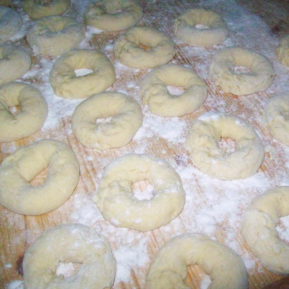 "velocità spiga" . Togliere, lasciare a riposare coperto per 30min. Lavorare un pò con le mani, aggiungere la farina q.b Prendere una quantità, formare un cordoncino (2cm circa), tagiare a pezzi di 20cm circa. Formare le ciambelline. Finire l'impasto. Friggere nell'olio caldo, asciugare con lo scotex, cospargere di zcchero a velo.