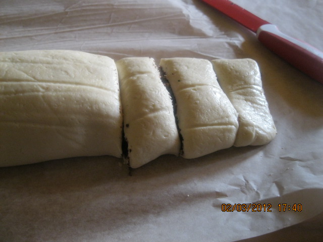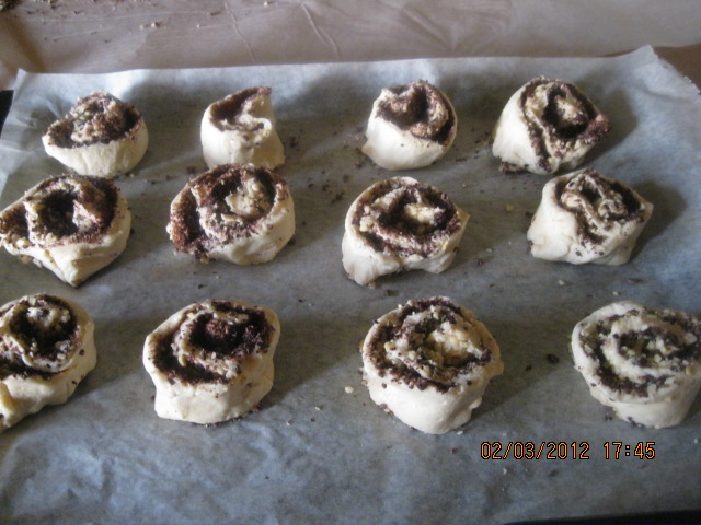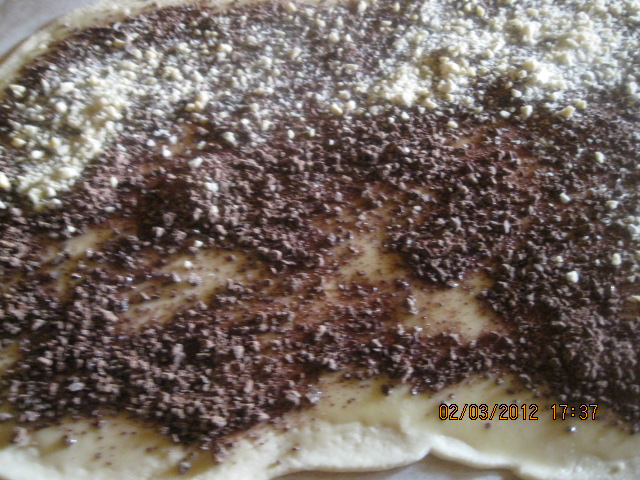 1. Inserire nel coperchio chiuso"coperchio chiuso" la ricotta scolata, il latte, l'olio, lo zucchero, la farina setacciata con il lievito , la vanillina, e il sale , per 1m vel 5,(all'occorenza mettere un pò di farina) , poi lasciare riposare in frigor per 1 ora.Stendere la pasta tra due fogli di carta da forno spolverizzata di farina , in uno strato di 3mm.Spalmare con un pennello l'albume su tutta la superficie. Cospargere di cioccolato e mandorle. Avvolgere la sfoglia aiutandosi con la carta da forno.Tagliare a fette di circa 4cm, disporre sulla teglia ricoperta da carta da forno e infornare a forno caldo 180° per 25/30m, Regolarsi con il propio forno. Quando sono freddi cospargere di zucchero a velo.