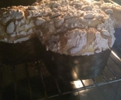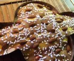 - Ora togliete dal frigo la glassa e distribuitela sulla colomba lievitata con una sacca da pasticcere. Cospargete inoltre con mandorle, codette di zucchero.
