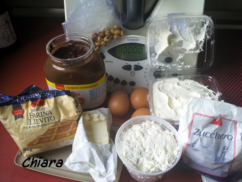 Preparate la crema: amalgamate il mascarpone, la ricotta, le uova e lo zucchero 20’’ vel 5.