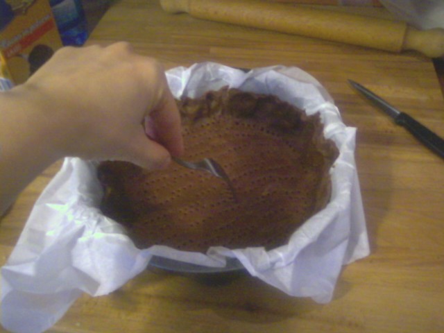 Stendere la frolla in una tortiera 24, bucherellare bene il fondo con una forchetta e creare dei bordi un pò alti.Mettere in forno a 180° per 25/30 min.