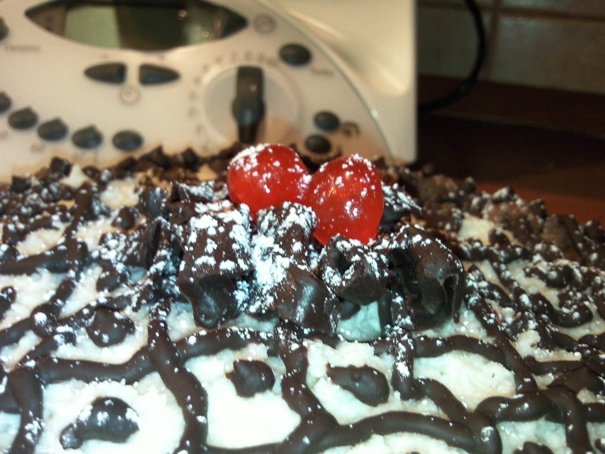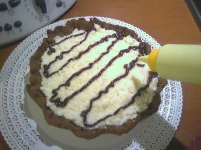 continuare per altri 2 min. 50° vel. 3Versare il cioccolato ottenuto in una siringa x dolci con beccuccio fine. Decorare a piacere la crostata.Io ho creato dei riccioli al cioccolato e ho completato la decorazione con zucchero a velo e ciliegine.TENERE IN FRIGO 1 ORA PRIMA DI SERVIRE.