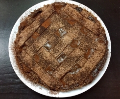 Una volta che la ganache si è raffreddata unisci la crema pasticcera e amalgama 30 sec vel 5. - Stendi 2/3 della frolla in un disco dello spessore di circa mezzo cm,posizionala sulla tortiera imburrata ed infarinata di 22 cm di diametro (eliminando l'impasto in eccesso ritagliando i bordi facendo scorrere il mattarello),bucherella la base con i rebbi di una forchetta,farcisci con la crema livellandola con un cucchiaio,quindi spiana la parte di pasta da frolla rimanente,forma le strisce di decorazione e sistemale sulla crema.