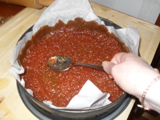 Inserire la marmellata e distribuirla uniformemente su tutta la superficie, aiutandosi con il dorso di un cucchiaio.