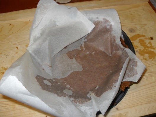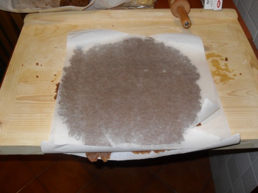 Togliere il foglio superiore e inserire, senza togliere il foglio inferiore, la sfoglia ottenuta nella teglia, avendo cura di farla aderire ai bordi della teglia e creando un bordo alto circa 2 cm.