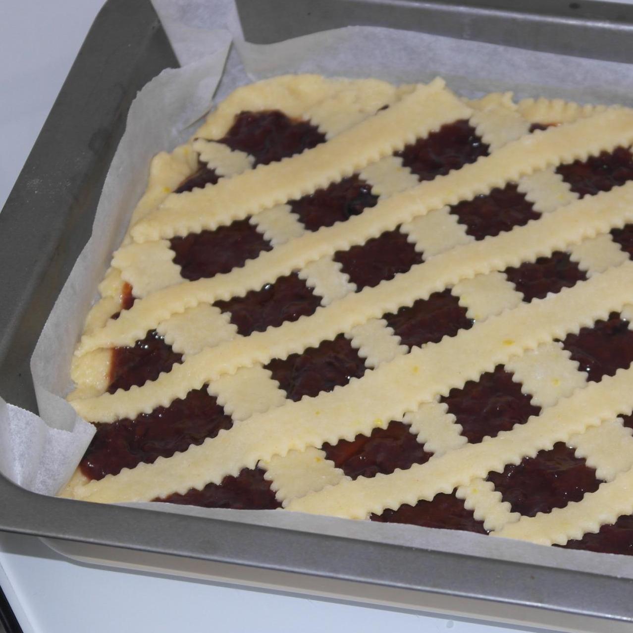 4. Stendere l'impasto a seconda della grandezza della propria teglia, tenendo da parte un po' di pasta per le striscioline della decorazione. Coprire con la marmellata e adagiare sopra di essa le striscioline di pasta frolla