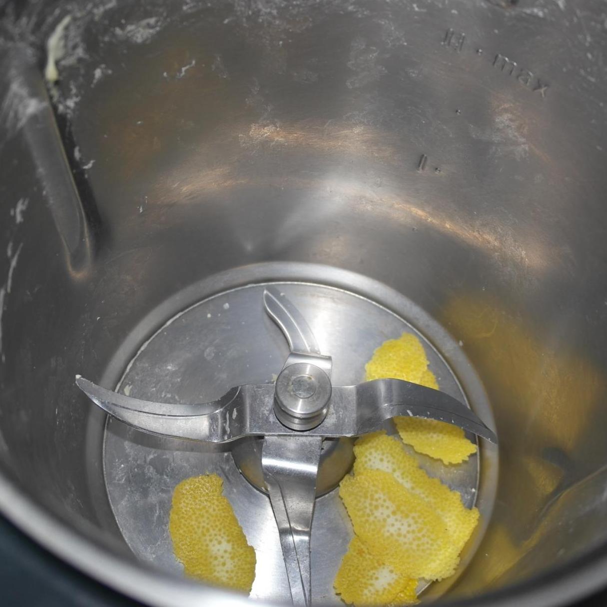 1. Tritare nel coperchio chiuso"coperchio chiuso" le bucce di limone con 50 gr di farina: 10 sec vel 8.