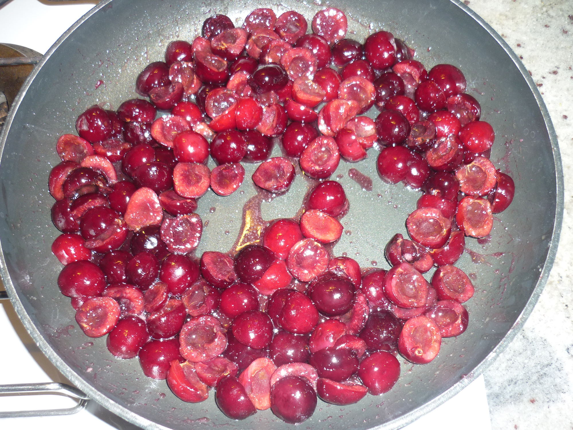 "coperchio chiuso" lo zucchero, le uova, farina, sale e miscelare per 5 min. vel. 3, unire il latte e far cuocere 7 min. vel. 4 a 90°. Togliere dal boccale e far raffreddare.Nel frattempo in una padella sciogliere la noce di burro, unire 2 cucchiai di zucchero e poi i duroni, far andare a fiamma bassa per 5 min. Lasciare raffreddare.