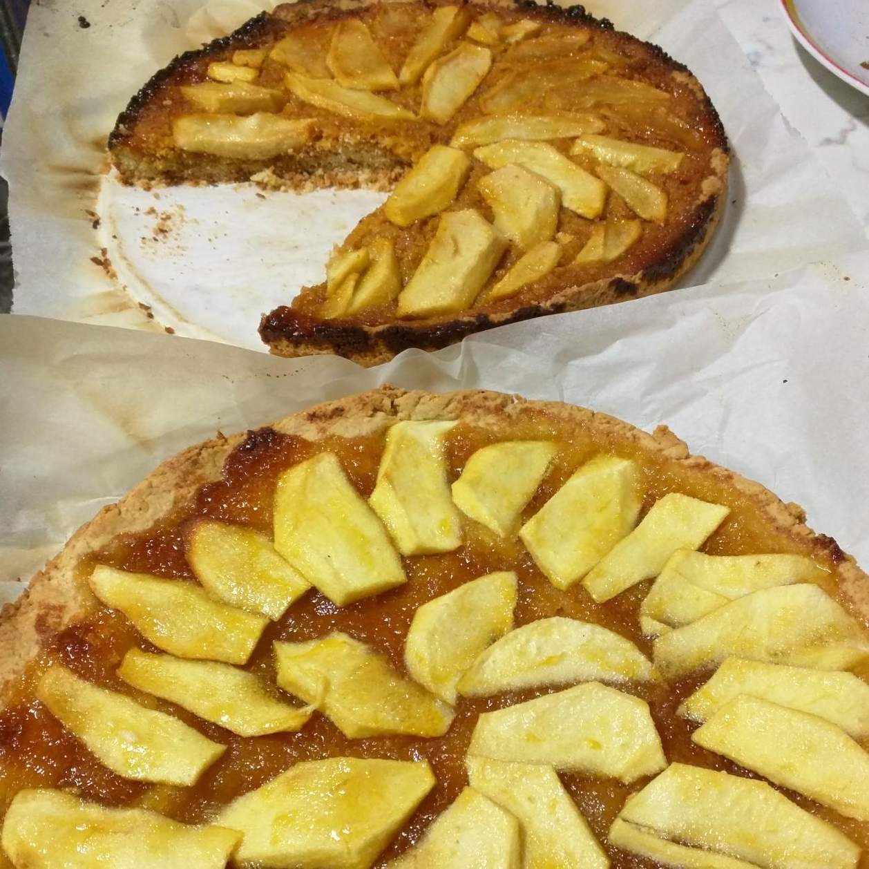 Distribuire uno strato di marmellata sulla pasta e decorare con le mele a fettine.