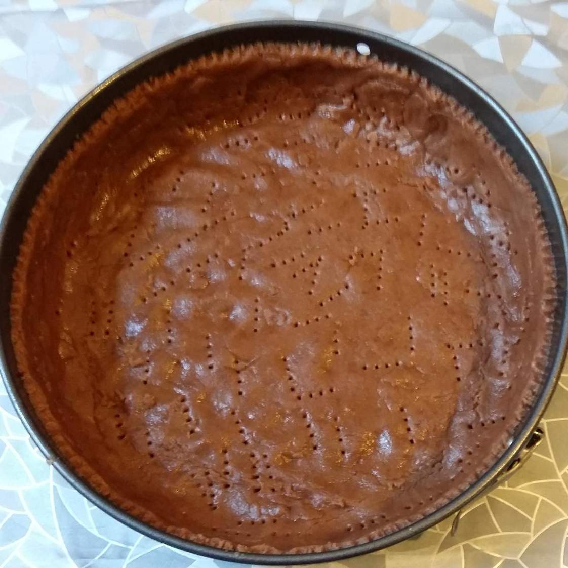 Prelevare la pasta frolla dal frigo, sul piano di lavoro infarinato stendere l'impasto fino ad uno spessore di circa 5 mm, rivestire uno stampo a cerniera del diametro di 24 cm alzando i bordi di circa 3 cm. Bucherellare il fondo con i rebbi di una forchetta, adagiarvi un foglio di carta forno e riempire di fagioli secchi per evitare che in cottura gonfi. Cuocere in forno caldo statico a 180° per 20 minuti. Sfornare e lasciare raffreddare.