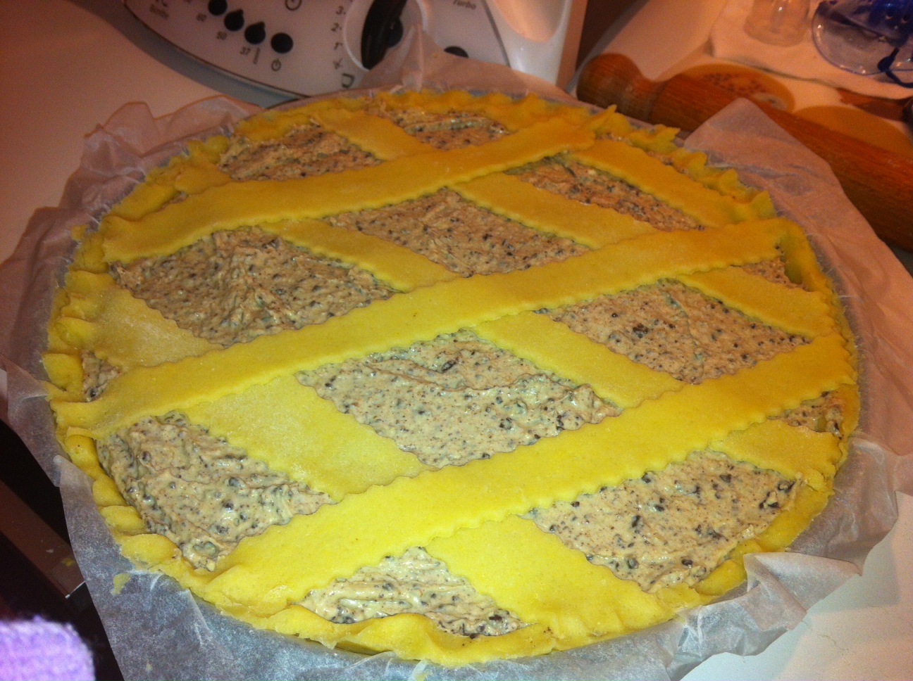 "coperchio chiuso" per vedere se il ripieno è ben amalgamato, altrimenti spatolare e fate andare qualche altro sec. vel.4.Stendere 3/4 di pasta su carta forno e rivestire uno stampo (28') bucherellare il fondo, ricoprire con il ripieno e poi con la restante pasta fare delle strisce o decori a piacere. Cuocere in forno 180° per 45 min.